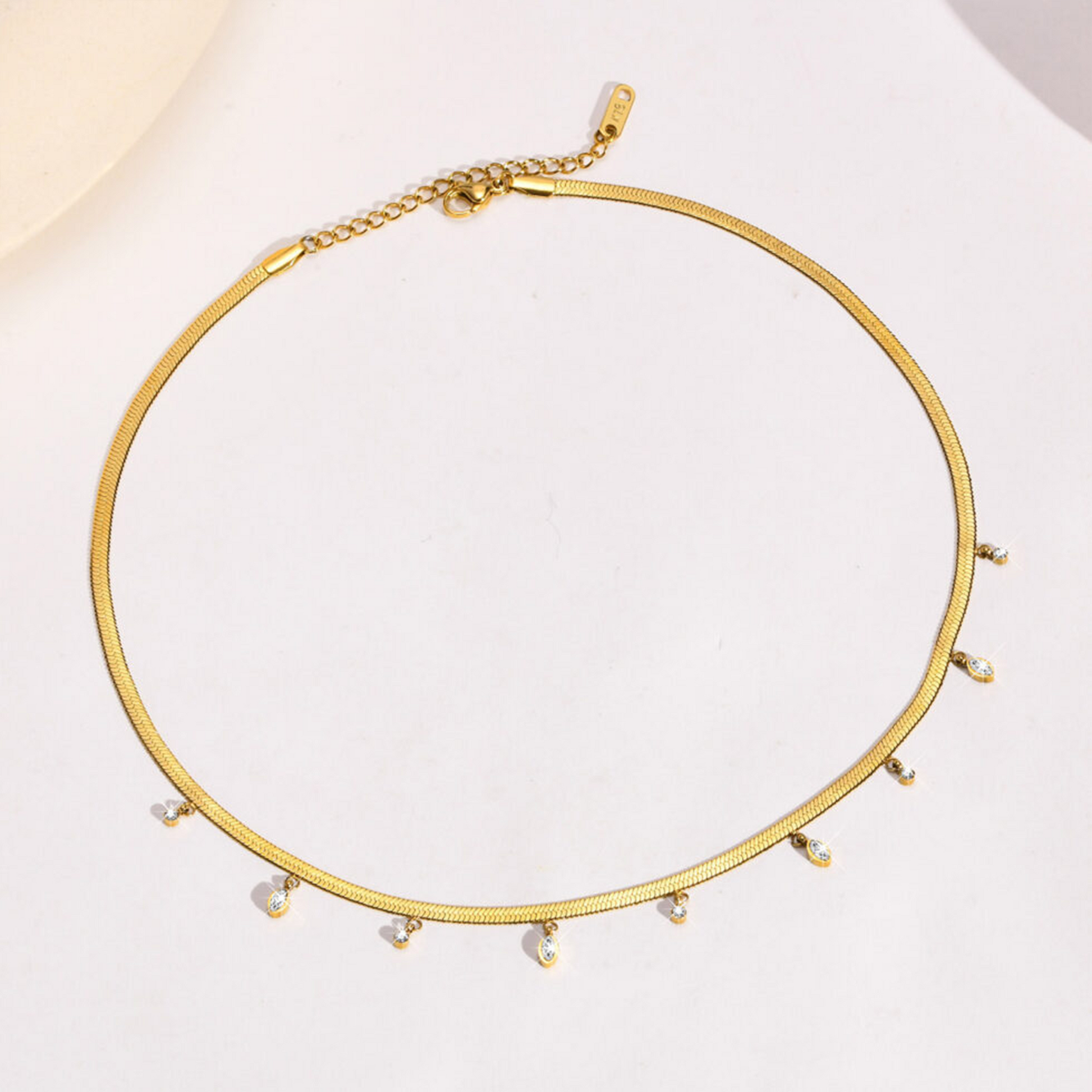 This elegant gold necklace is adorned with small bead style drops, adding a touch of sophistication to any outfit. Perfect for both casual and formal occasions, this versatile piece is sure to become a staple in your jewellery collection. Made with high-quality materials and embellished with the finest quality AAA cubic zirconia stones, this necklace is both stylish and durable, making it a timeless accessory that you can enjoy for years to come.